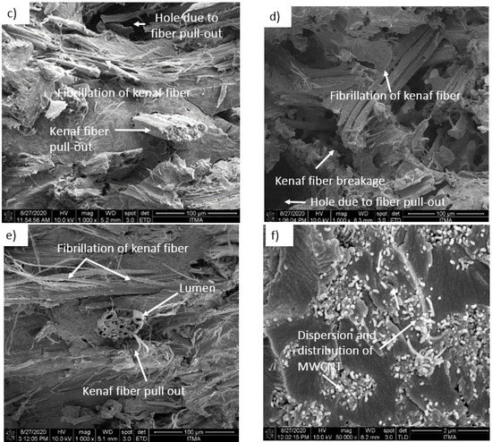 Figure 5d,e clearly show the fibrillation of elementary fiber in the kenaf fiber bundle when the tension load was applied. Fibrillation occurred due to the removal of binding substances. It was confirmed by [35,36], who found that the alkalization mediated fiber fibrillation, such as the axial separation of elementary fibers had led to decreased fiber diameter, an increase in aspect ratio, and an efficient surface region. The elimination of surface impurities such as wax and cuticle in the surface on natural fibers had enhanced fiber–matrix adhesion by allowing both mechanical interlocking and bonding reactions. It also indicated that in the phenolic resin, the kenaf fiber failure was in ductile behavior mode, while the failure of CR fiber was in brittle behavior mode (Figure 5). The brick wall structure of CR fiber did not support the tensile load as much as the kenaf fiber. Another reason could be that the kenaf fiber was a denser and thicker wall (because of the smaller lumen size) than the CR fiber, so the load could be transferred more effectively, as illustrated in Figure 6. Fibril kenaf fiber prolonged the failure when the tensile load was applied, but there was a sudden fracture in the CR fiber when the tensile load was applied. Fibrils are more capable of rearranging themselves in the direction of tensile deformation, facilitating load distribution in the fibers and reducing the stress concentration [37]. As a result, kenaf fiber had been shown to improve ductility in MWCNT–phenolic by as much as 25% compared to the CR fiber.