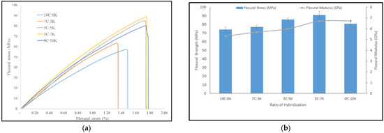 (a) Flexural stress vs. strain curve and (b) flexural strength and modulus, of hybridization between CR and K fibers.
