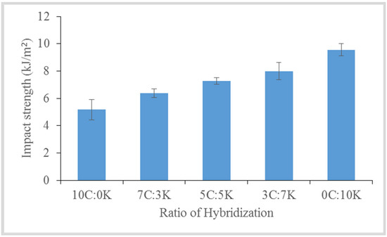 The impact strength of hybrid CR/kenaf fiber reinforced with MWCNT–phenolic composites is shown in Figure 8. It was observed that the 0C:10K composite exhibited the highest impact strength of 9.56 kJ/m2, whereas the 10C:0K composites provided the lowest impact reading of 5.17 kJ/m2 compared to other composites. It was also observed that the addition of kenaf fiber into CR composites had increased the impact strength compared to the CR phenolic composites. Kenaf fiber is more compatible with the phenolic matrix in order to enhance the impact strength. A similar result was found by [41], where the addition of kenaf fiber had improved the impact strength of novolac phenolic resin from 4.77 kJ/m2 to 7.8 kJ/m2. Improvement of impact strength was attributed to the existence of crystalline cellulose in high crystalline kenaf fibers [42] and fibrillation. In phenolic composites, NaOH-treated kenaf fiber fibrillation dissipated more fracture energy and thus increased toughness [43]. The results imply that kenaf fiber complements CR fiber-reinforced phenolic composites to improve the impact properties. Furthermore, the chemical structure and architecture of the kenaf and CR fiber’s cell wall (primary wall, secondary wall, and middle lamella) provided higher impact properties for phenolic composites. Pristine phenolic has very poor impact power relative to fiber-reinforced polymer composites [44]. It is apparent that fiber plays an important role in the composite’s impact strength as it interacts with a crack forming inside the matrix and serves as a stress transfer medium.