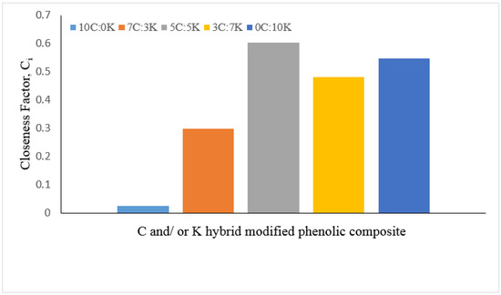 Relative closeness factor of C and/or K hybrid MWCNT–phenolic composite.
