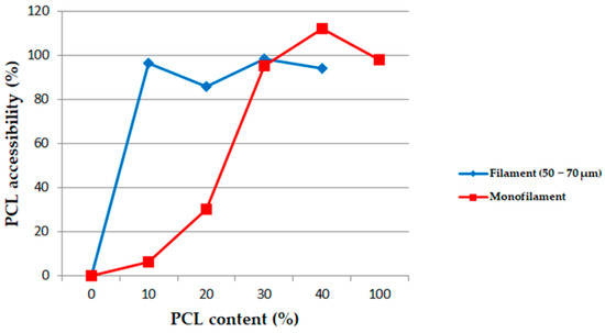 The PCL accessibility’s dependence on the PCL content in the PLA/PCL blends is illustrated in Figure 1. One curve represents the PCL accessibility in an extruded monofilament cut into small compounds (squares), while the other one shows PCL accessibility in the corresponding melt-spun multifilament (diamond).