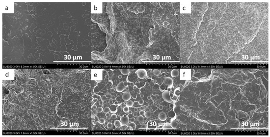 For the blend containing 30 wt% of PCL (PLA70/PCL30), the particles were elongated, leading to a “fibrillary” morphology (Figure 3d). Finally, for the last blend studied in this work, namely, 40 wt% of PCL (PLA60/PCL40), the phase morphology was co-continuous. These SEM images are supported by the PCL accessibility of over 100%, which means that PLA particles were trapped in the PCL matrix.