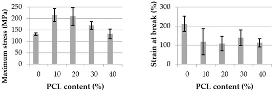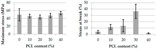 The maximum stress and strain at break for extruded monofilaments of each blend are illustrated in Figure 4. As expected, the maximum stress did not significantly change with the increase of PCL content. However, even if the neat PLA strain at break was low, it increased with the PCL content up to 30 wt% added. In the co-continuous blend with 40 wt% PCL, this property strongly decreased. The same trend with a very low strain at break was observed by Navarro-Baena et al. [11] for neat PLA and co-continuous blends. Additionally, the highest strain at break was found for the blend containing 30 wt% PCL. The authors explain these results in terms of a poor adhesion between both polymers in a co-continuous morphology.