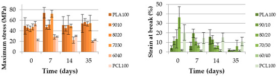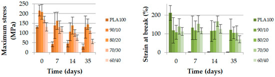 Maximum stress (MPa) and strain at break (%) of the PLA/PCL extruded monofilaments according to time.