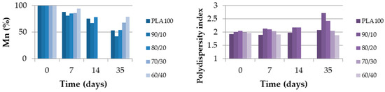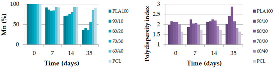The GPC and DSC test results show how the different physical properties evolved over the degradation time. Figure 7 shows the molecular weight (Mn) as a percentage and the polydispersity index (PDI) of each blend during the degradation. The molecular weight is displayed out of 100 because the reference molecular weights were different due to the PCL amounts. Figure 8 shows the degree of crystallinity of the PLA part during the degradation. As shown in Figure 7, the molecular weight of neat PLA was seriously decreased after 35 days. The same trend was noticed for blends with 0, 10 and 20 wt% of PCL, with a remaining Mn proportion of 40% or less. Furthermore, for PLA70/PCL30, the molecular weight decreased slowly, and for PLA60/PCL40 and neat PCL, the molecular weight did not decrease to lower than 80% of the initial value. The evolution of the polydispersity index during the degradation is presented in Figure 7. It shows that neat PLA and PCL, as well as PLA60/PCL40, which presents a co-continuous morphology, were degraded in a homogeneous way and this was not the case for the nodular and fibrillar morphologies. Indeed, the polydispersity index reached 2.9 at day 35 for the PLA80/PCL20 blend. This phenomenon was explained by Sengupta et al. [25]: PCL acts as a nucleating agent that increases the crystalline ability of the PLA matrix.
