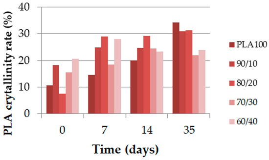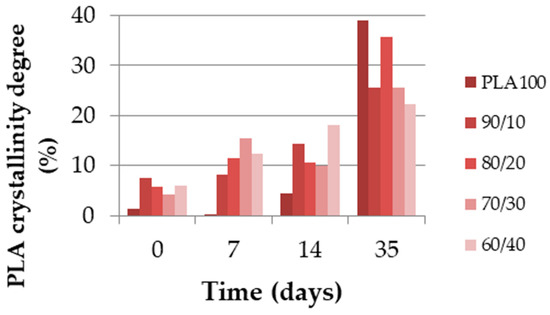 Figure 8 shows very clear results about the PLA crystallinity degree. This property increased over time in every blend, especially in the case of neat PLA, which increased from almost 0 to 40%. The crystallinity degree of every other blend was under 10% and increased to more than 20% after 35 days. This was explained by Tsuji et al. [20] as an increase in the PLA chain mobility due to the decrease in molecular weight during the hydrolysis of ester groups. As a consequence, the crystallinity degree of PLA increases.