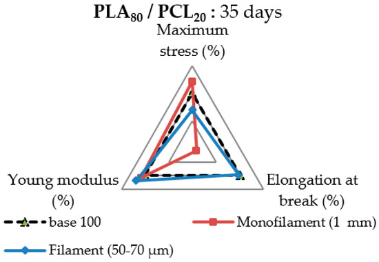 Mechanical properties of the PLA80/PCL20 blend after 35 days of degradation in comparison with an extruded monofilament and a melt-spun filament as a percentage.