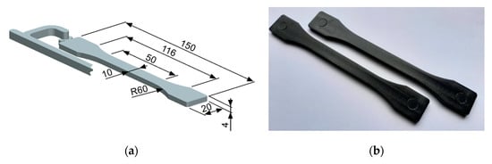 Specimens according to ISO 527 were injection-molded on an Allrounder 320 C 500–170 injection molding machine (Arburg GmbH + Co KG, Lossburg, Germany). The geometry and dimensions of the specimen are shown in Figure 1a. The PP/MWCNT pellets were first dried at 90 °C for 2 h into a thermolift (Arburg GmbH + Co KG, Lossburg, Germany) and then conveyed to the injection molding machine. The injection molding experiments were carried out with the following parameters: injection flow rate, 30 cm3/s; maximum injection pressure, 500 bar; mold temperature, 50 °C; two melt temperatures (die zone), 200 and 220 °C; cooling time, 20 s. After injection molding, the specimens were conditioned in a standard laboratory environment for 24 h before further characterization. Figure 1b shows the injection-molded PP/MWCNT specimens with 5 wt.%.