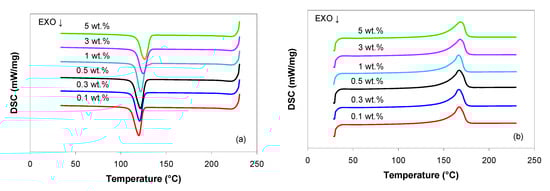 The melting peak temperature of PP/MWCNT nanocomposites is not significantly affected by the addition of MWCNTs. The DSC heating scans (Figure 2b) and Table 1 show that the melting peak temperature is about 167–168 °C.