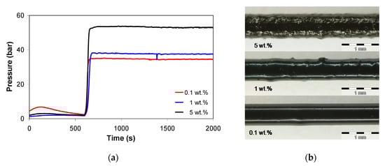 To verify the stability of the PP/MWCNT nanocomposites during the rheological measurements and consequently during the manufacturing processes such as extrusion and injection molding, thermal stability tests were carried out. In general, if thermal degradation occurs in a polymer melt, the viscosity reduces as a result of decreasing molecular weight. Figure 3a shows the variation of pressure recorded during the extrusion of the PP/MWCNT nanocomposites with 0.1, 1, and 5 wt.% of MWCNTs at a constant shear rate and temperature of 250 s−1 and 220 °C, respectively. It can be seen that the pressure is constant during extrusion under constant shear rate, indicating very good stability of the nanocomposite melt during capillary extrusion. Moreover, the pressure increases with increasing MWCNT loading, due to the increase in nanocomposite melt viscosity. However, as MWCNT loading increases, the surface of the extrudate undergoes a transition from stable and glossy (up to 1 wt.%) to mat and stick-slip flow, most probably due to CNT agglomeration (5 wt.%), as shown in Figure 3b.