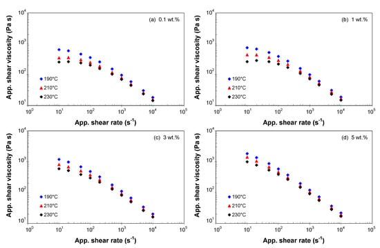 Apparent shear viscosity vs. apparent shear rate for the PP/MWCNT nanocomposite with (a) 0.1 wt.%, (b) 1 wt.%, (c) 3 wt.% and (d) 5 wt.% of MWCNTs (L/D = 30/1).