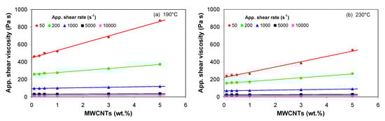 Apparent shear viscosity as a function of MWCNT loading at a shear rate of (a) 190 °C and (b) 230 °C.