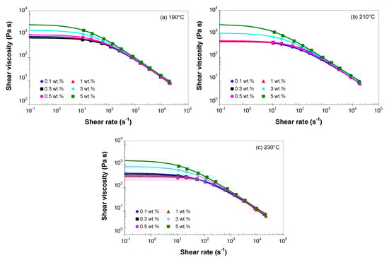 The Cross model was fitted to the (corrected) shear viscosity data using the WinRHEO II (Göttfert GmbH, Buchen, Germany) and the model parameters are listed in Supplementary Tables S1–S3. It should be noted that the values were obtained by extrapolation, since the smallest available shear rate was 10−1. Figure 6 shows a comparison between the viscosity curves predicted by the Cross model (Equation (4)) and experimental data for 190, 210, and 230 °C. It can be seen that the dependences of the melt shear viscosity on temperature, shear rate and MWCNT loading are well described by the Cross model, and the experimental data are very well predicted by this model.