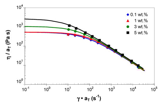 Another observation from Table 4 is that at low MWCNT loadings (1 wt.% and below), the values of parameter, as predicted by the Cross model, remain at the same level; however, there is a significant increase in the values at 3 wt.% and 5 wt.%. As stated before, the values were obtained by extrapolation and, therefore, should be interpreted with care as the smallest shear rate value in the experiment was 10 s−1 and the is recommended to be measured at 10−3 s−1 or less.