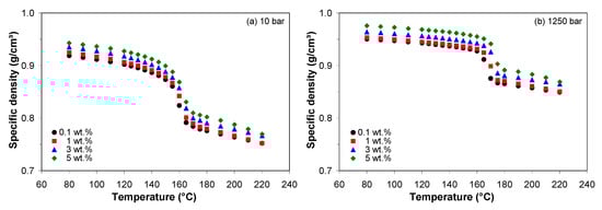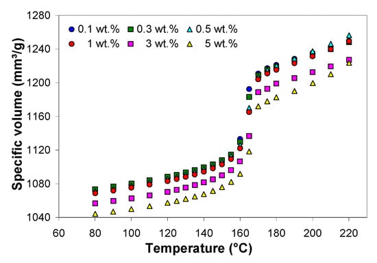 Figure 11 shows the variation of the density calculated from the pVT data as a function of temperature and pressure for different MWCNT loadings. The data for 0.3 and 0.5 wt.% were not shown since there is no statistical difference between the density at 0.1, 0.3, and 0.5 wt.%. At constant pressure, the density of the PP/MWCNT nanocomposite decreases with increasing temperature and increases with increasing MWCNT loading. In addition to the temperature dependence, the density is dependent on the pressure, i.e., the specific density shifted to higher values with increasing pressure.