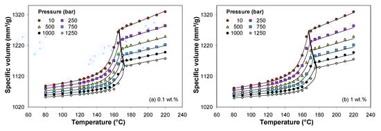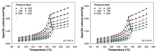 A capillary rheometer (Rheograph 75, Göttfert GmbH, Buchen, Germany) equipped with a capillary quick-lock-system was used to measure the specific volume as a function of pressure and temperature (e.g., the pVT diagrams) The measurements were carried out according to ISO 17744, and additional details on the measurement principle can be found in [,]. The tests were carried out in cooling mode in order of decreasing temperature from 220 to 80 °C. For each temperature, the initial pressure was 10 bar, which was increased to 100, 250, 500, 750, 1000, and 1250 bar.
