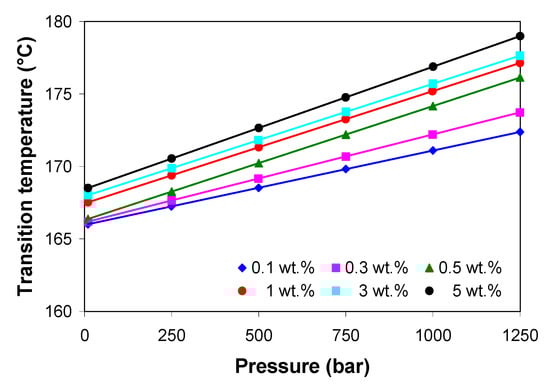 Figure 10 shows the transition temperature as a function of pressure and MWCNTs as predicted by the 2-domain Tait model. The transition temperature of the PP/MWCNT nanocomposites increased linearly with increasing pressure. The shift of the transition temperature to higher value indicates that, under pressure, the PP/MWCNT nanocomposites crystallizes at higher temperatures as compared with the DSC transition temperature, which varies between 120 to 126 °C (Table 1).