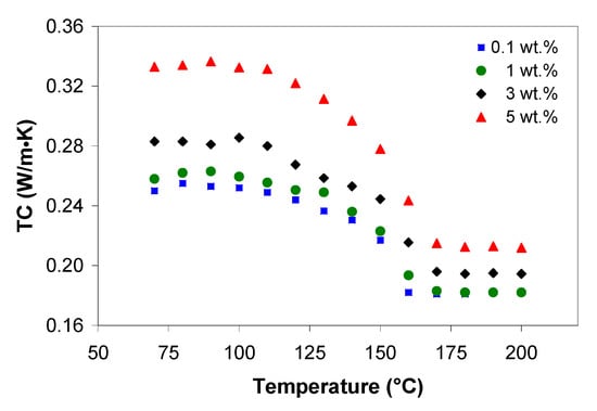 Thermal conductivity measurements were carried out on a capillary rheometer (Rheograph 75, Göttfert GmbH, Buchen, Germany) equipped with a capillary quick-lock-system and a thermal conductivity probe. The measurements were carried out according to ASTM D5930 under cooling mode, in the temperature range of 200–70 °C, at 10 °C intervals. For each temperature, three pressures were applied in increasing order, i.e., 100, 250, and 500 bar, and, for each pressure, two successive measurements were run to check the reproducibility. Additional details on the measurement procedure can be found in []. Given the cylindrical shape of the sample, the TC was measured in radial direction and, therefore, is regarded as the through-plane TC. On the other hand, the preparation of the sample could be compared with compression molding process, where little flow of the molten matrix takes place, thus no significant filler orientation occurs, resulting in an isotropic material []. Therefore, the TC value might also be regarded as the average of thermal conductivity in the in-plane and through-plane directions.