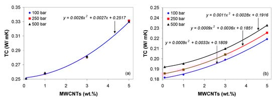 - The thermal conductivity of the PP/MWCNT nanocomposite decreases with increasing temperature and increases with increasing MWCNT loading. In the melt state, the thermal conductivity increases with increasing pressure and the effect is statistically significant. The highest value of thermal conductivity (0.35 W/m K) was achieved in the solid state at 5 wt.% of MWCNTs.