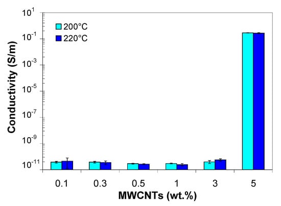 In particular, the electrical conductivity is nearly independent of nanotube loading up to 3 wt.%, beyond which the conductivity increases with MWCNT loading. The electrical conductivity displays an abrupt increase from 10−12 S/m to 10−1 S/m, which is typical of the percolation phenomenon [,]. The 7-order increase indicates that the electrical percolation threshold in the PP/MWCNT nanocomposite is in the range of 3–5 wt.%, and a fully conductive network that spans the entire composite is formed at 5 wt.%. One of the reasons for the insulating nature of the PP/MWCNT nanocomposites up to 3 wt.% of MWCNTs is the absence of a continuous conductive path; as a result, the electrical conductivity is achieved by hopping of charge-carriers from one conductive site to another []. The high percolation threshold (between 3 and 5 wt.%) could be related to the crystallization process and the nucleating capability of CNTs in PP. Due to participating in the nucleation of PP crystals, CNTs could not concentrate and form conductive networks through an enhanced volume exclusion effect [].