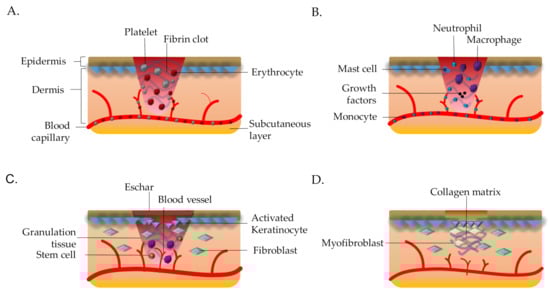 The myriad of wound healing processes. (A) Hemostasis process involves excretion of platelet to reduce the blood loss and formation of preliminary matrix (fibrin clot). (B) Inflammation involves the inflammatory cells to fight infection and debris removal. (C) Proliferation process where keratinocytes migrate to reduce the wound gap, fibroblasts proliferation replaces initial fibrin clot with granulation tissue and formation of new blood vessels occurs. (D) Remodeling phase causes the wound contraction that initiated by fibroblasts and myofibroblasts. Adapted with permission [8]. Licensed under CC BY 4.0.
