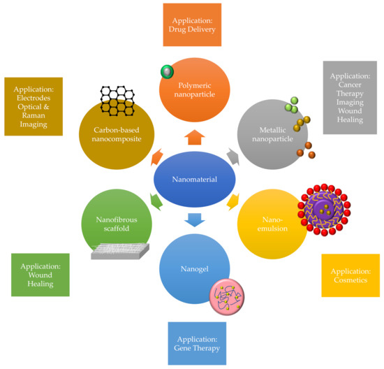 The development of nanotechnologies provided an improvement in health industries with current innovation of functional and smarter nanomaterials to tackle the drawbacks for unintended wound as well as provide better outcomes among patients. Recently, the nano-based technologies have shown significant roles in wound healing and regenerative medicine applications. Nanotechnologies also improved the interaction between tissue and materials through biomimetic approach, helps in tissue regeneration whilst provide better micro-morphology and properties resembling the native tissues [23]. There are different types of nanomaterials have been implemented in tissue engineering models such as the uses of metallic nanoparticles, polymeric nanoparticles, nano-emulsions, solid lipid nanoparticles, nanospheres, nanogels, nanofibrous scaffold and carbon-based nanocomposite that have shown positive result in wound healing research [24,25]. Figure 2 showed some example of nanomaterials used in wound healing. Nanoparticles primarily can be classified into two groups which are organic and inorganic nanomaterials.