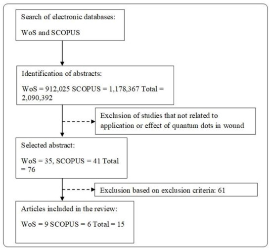 Literature search was done on the reports regarding the effect of quantum dots (QDs) on biomedical and clinical applications, especially in the wound healing process. Figure 3 shows the overall literature search of this review. Original research articles (in vitro, in vivo or in ovo study) which discuss the effects of QDs in wound healing (cell proliferation, cell migration, angiogenesis, and cell toxicity) and the main priority of QDs applications in tissue engineering that involved in wound care management. The studies involve a different type of QDs (derived from a different type of heavy metals) are included in this review. Studies on the cells involved during wound healing such as (1) fibroblasts; (2) keratinocytes; or (3) endothelial cells were also included. The exclusion criteria for this review would be all secondary literature and any original articles that have been wrote and submitted in other languages other than English. Studies focusing on the effect of QDs towards diseases e.g., cancer were excluded from the review. Figure 3 shows the flow diagram of articles selection.