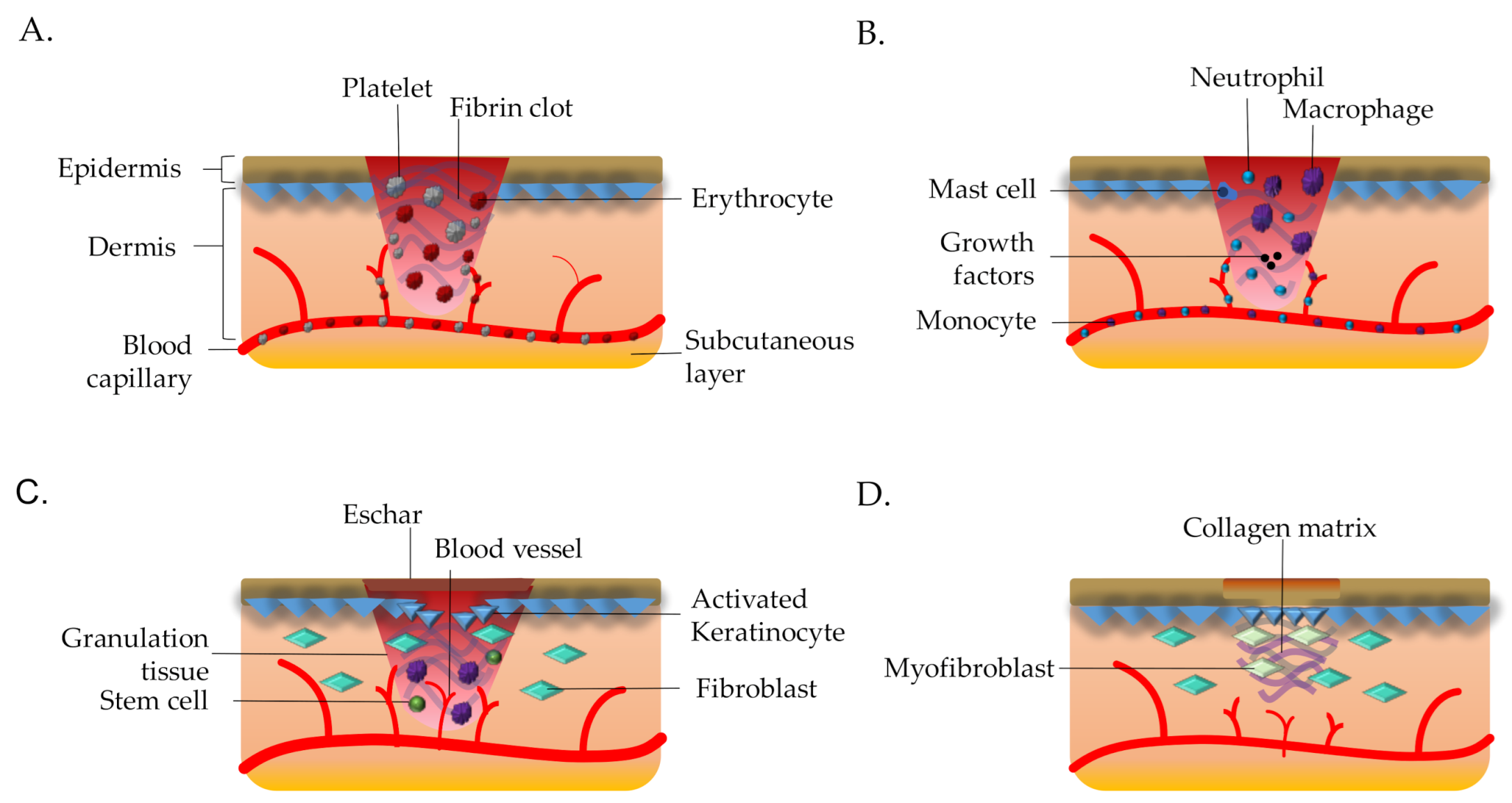 | Hemostasis [16] | Exposure of collagen initiates intrinsic and extrinsic clotting cascades Thrombocytes aggregated and triggering the vasoconstriction Blot clot formation to act as a temporary wound matrix—assist in migration of cells Blood vessels dilated; thrombocytes and leukocytes migrated after 5 to 10 min of vasoconstriction Platelets degranulated—cytokines and growth factors released into the wound |