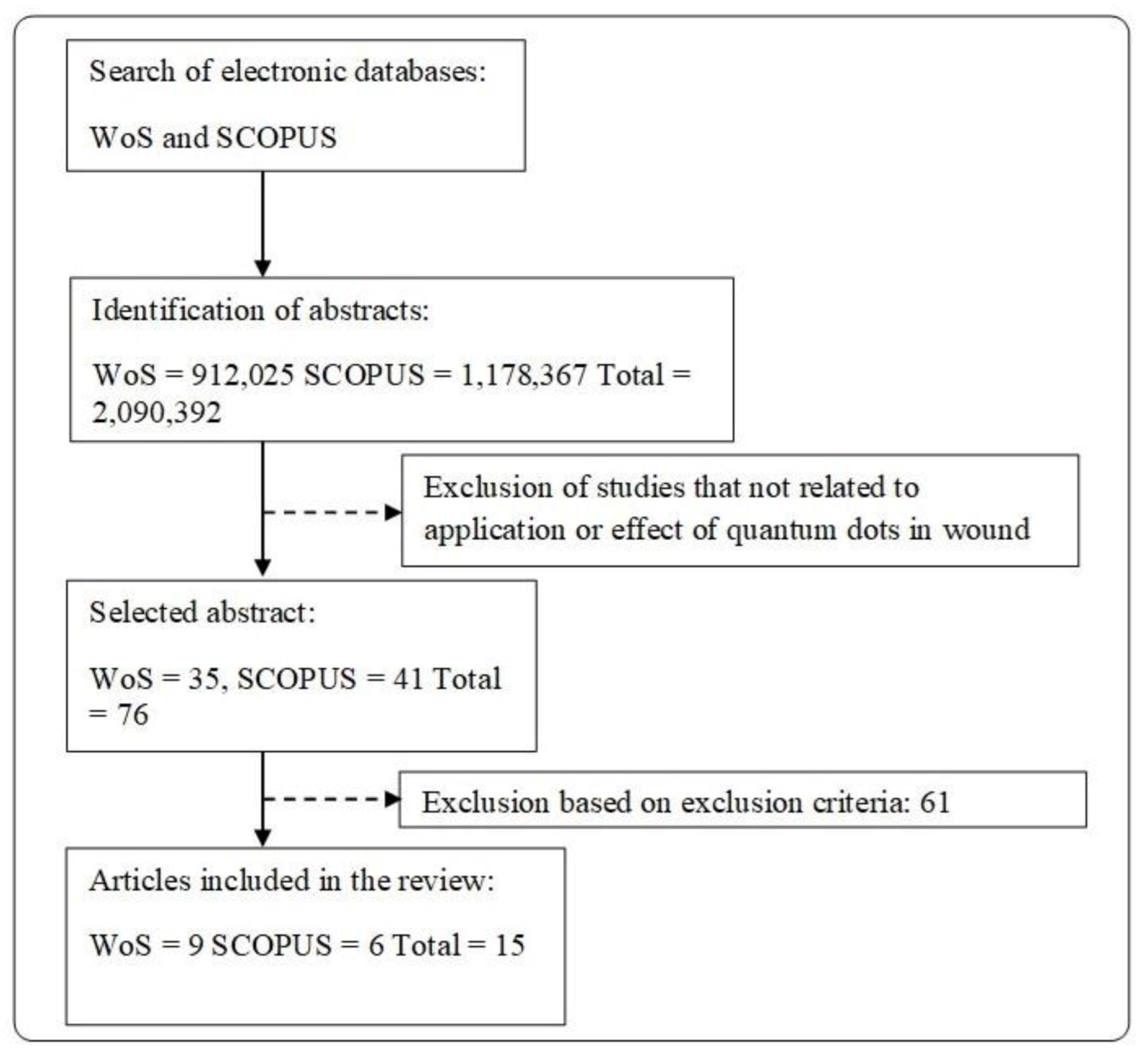 | 2 | Zhao et al., 2019 [49] | Sprague-Dawley rats Weight 250 ± 20 g Full thickness wound (1.80 cm2) | NCQDs | 1. Wound morphology 2. Histological evaluation (H & E stain) 3. White blood count (blood slide) | Treatment with NCQDs have significantly higher healing rate where the wound area is 0.2% at the 14th day of treatment and lower white blood count which is 1 × 1010 L−1 indicate decrease of inflammation in wound area | NCQDs show effective treatment towards wound healing |