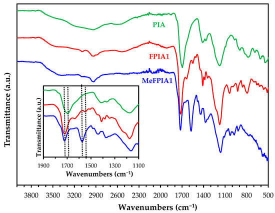 Fourier transform infrared (FTIR) spectra of PIA, modified FPIA1, and quaternized MeFPIA1 polymer.