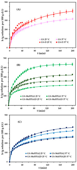 Swelling curves of the different films at 25 °C and 37 °C in phosphate buffer solution (PBS) buffer solutions: (A) GS and GS-D, (B) GS-MeFPIA1 and GS-MeFPIA1D, and (C) GS-MeFPIA2 and GS-MeFPIA2D.