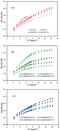 Representation of (Wt − W0)/W0 versus t1/2 at 25 °C and 37 °C in PBS buffer solutions of (A) GS and GS-D, (B) GS-MeFPIA1 and GS-MeFPIA1D, and (C) GS-MeFPIA2 and GS-MeFPIA2D.
