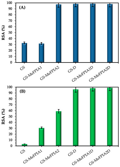 Discs of about 10 mg of each sample were cut and placed in eppendorf tubes with 1 mL of the corresponding Bn solution. After 30 min of reaction in the dark with slight agitation, the absorbance of the solution was measured at a wavelength of 734 nm. Each condition was observed at least in duplicate. The antioxidant activity of the different films was calculated by the radical scavenging activity percentage (RSA(%)), as described in Equation (6).