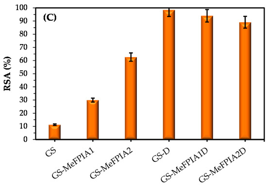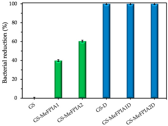 The results presented in Figure 7 show the bacterial reductions (%) of the elaborated films after a 24 h incubation period at 37 °C with slight agitation in contact with S. aureus bacteria. Based on the reduction percentages obtained, it can be concluded that films with dopamine, GS-D, GS-MeFPIA1D, and GS-MeFPIA2D, showed complete inhibition due to the antimicrobial activity of the phenolic compound [55]. In addition, films containing MeFPIA1 and MeFPIA2 (without dopamine) also presented antimicrobial activity. This activity was even greater for those samples with MeFPIA2, as expected, because that polymer presented a higher degree of functionalization (quaternization), and more cationic groups are available at the film surface for contact killing behavior. The control samples, without MeFPIAx and without dopamine, did not show any inhibition. Koser et al. [73] studied the nutritional requirements of some bacteria, and indicated that gelatin was used by microorganisms as a growth-promoting source. Considering this and taking into account that the control films were the weakest and lost their integrity over time, as mentioned in Section 3.4, the microorganism surely used gelatin, as a nutrient for its growth, presenting a number of colony forming units greater than the initial one.