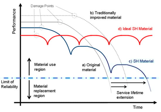 Lifetime extension of engineered materials by implementation of self-healing principles. (reproduced from [5] with permission from Elsevier).