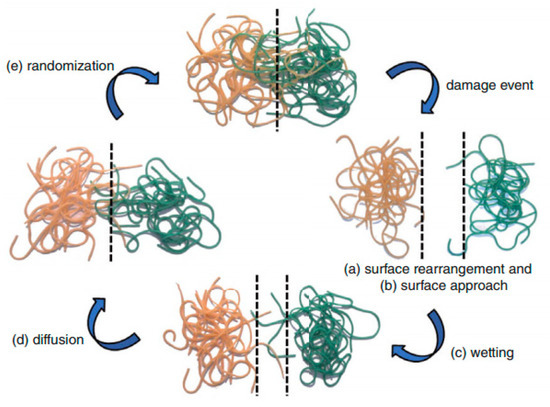 Self-healing principles based on physical interactions have been one of the earliest observed self-healing behaviors of engineered polymers. To describe the complex strength recovery process at broken polymer/polymer interfaces, Wool and O’Connor proposed a five-stage mechanism [45], as illustrated in Figure 2. Surface rearrangement (a) and surface approach (b) are the most crucial steps because healing can only take place if the ruptured interfaces are in contact with each other. The wetting stage (c) enables diffusion (d), which results in the entanglement of polymer chains and, therefore, in the subsequent recovery of the mechanical properties of the healed material. Finally, during the randomization stage (e), the complete loss of initial crack interfaces can be observed.