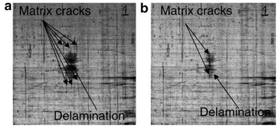 Hayes et al. developed a system in which a thermoplastic healing agent is dissolved in epoxy [48]. Upon heating a fractured compact tension (CT) specimen, the thermoplastic material diffuses through the thermosetting matrix, closing cracks and facilitating self-repair. Healing efficiency turned out to increase either with increasing healing temperature or amount of thermoplastic agent. Epoxy systems containing 20 wt% of healing agent showed a 64% recovery of impact strength when healed at 140 °C, while after a 130 °C, 1 h healing cycle, cross ply glass fiber composites whose matrix contained 10 wt% of thermoplastic agent, exhibited more than 30% reduction in damaged area, as assessed via computer-based image analysis (Figure 3). However, since the addition of great amounts of thermoplastic healing agent is detrimental to thermomechanical properties, the system was optimized with 7.5 wt% of healing agent, yielding 43–50% healing efficiency for the resin as a standalone, but confirming 30% recovery of damaged area on cross ply fiberglass composites [49].
