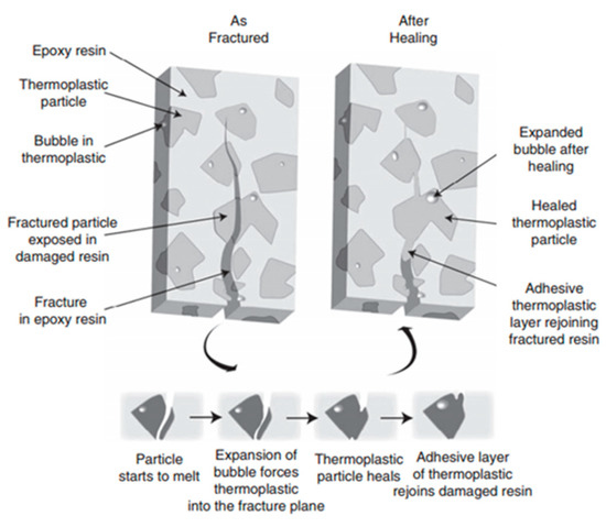 Healing agent delivery mechanism used by the mendable epoxy resins containing EMAA particles (reproduced from [57] with permission from Elsevier).