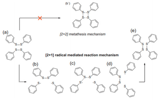 For aromatic crosslinks, both [2 + 2] metathesis and [2 + 1] radical-mediated mechanisms have been studied in the literature to describe how disulfide bonds break and re-form (Figure 6). In the first case, the disulfide bonds would break and form simultaneously, while in the radical-mediated mechanism the breaking of one disulfide bond would lead to the formation of sulfur-centered radicals that would eventually attack other disulfide bonds. Some works have been published with both mechanisms used indistinctly to describe the exchange reaction, while other researchers have described the disulfide exchange without specifying the underlying mechanism. Given that, further analysis of the mechanisms involved was carried out by Matxain et al. [104]: no computational evidence was found for the existence of a metathesis transition state, thus a radical-mediated [2 + 1] mechanism was proposed for the dynamic behavior in aromatic disulfide systems.