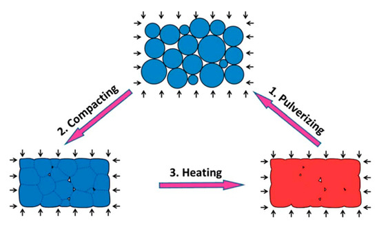 The schematic graphs for a typical reprocessing and recycling routine. (1) Bulk polymer is firstly pulverized into powders. (2) The powders were then compacted by applying pressure. (3) The compacted powder is heated under pressure. Due to the internal bond exchange reaction (BER), the polymer particles are welded, and interfaces are disappeared. This process is repeated several times (reproduced from [110] with permission from Royal Society of Chemistry).
