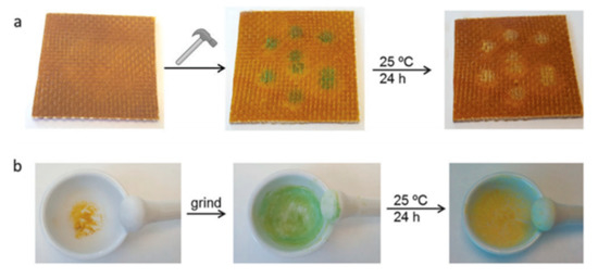 (a) Photographic sequence showing the glass-fiber composite being hit using a hammer, which resulted in the appearance of green spots, and, after 24 h at room-temperature, the green color disappeared. (b) Photographic sequence showing how cured epoxy vitrimer in the form of powder became green after grinding in a mortar. After 24 h at room-temperature the green color disappeared (reproduced from [123] with permission from Royal Society of Chemistry).