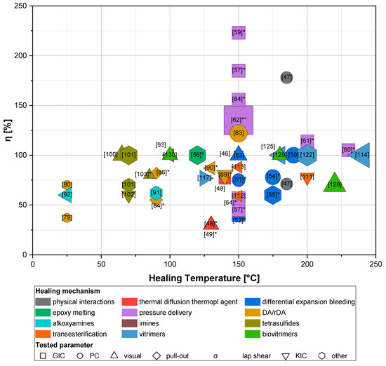 Healing efficiency provides a single, very useful parameter to evaluate self-healing performances. However, a few considerations have to be made not to let oneself be misguided by it: (i) as already stated, the added self-healing functionality should not come at the expense of significantly reducing the virgin properties of the material, and because increasing healing efficiency can be achieved not only by increasing the healed material property, but also by reducing the virgin functionality, in all cases the virgin properties and how they change with added self-healing features should be reported and subsequently taken into account when assessing η [10]; (ii) with fracture-based definitions of healing efficiency (i.e., fracture toughness, KIC, and fracture energy, GIC) it is possible to obtain efficiencies greater than 100%, because fracture tests require the presence of a pre-crack in order to perform the measurements, thus potentially underestimating the fracture properties of pristine, un-cracked samples; (iii) sometimes materials do not reach a complete cured state before testing, thus a portion of the recovered functionality may be given by residual curing phenomena, sparked by the healing cycle. Nevertheless, this effect is easily measurable via FTIR or calorimetric analyses, and thereby included in the healing performances assessment. Therefore, it should be noted that it can be inaccurate to directly compare healing efficiencies reported in different publications measured using different functionalities and test protocols.