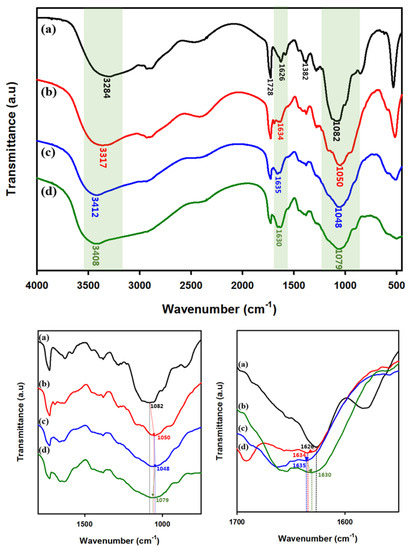 The FTIR spectra of the lyophilized succinoglycan and SCx were recorded via an FTIR spectrometer (Spectrum Two FT-IR, Perkin Elmer, Waltham, MA, USA) with a PIKE MIRacle ATR accessory at a resolution of 1 cm−1 using eight scans in the wavenumber range of 4000–600 cm−1.