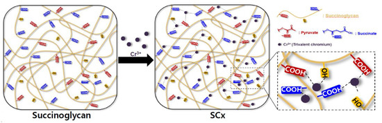 A salecan-based hydrogel co-ordinated with Cr3+ as a crosslinking agent affects the expansion capacity, pore size, and mechanical strength of the hydrogel by changing the Cr3+ concentration [34]. In the study of xanthan/Cr3+ systems, the gelation time changed based on the change in pH [43], where the properties of these crosslinks, formed primarily through the formation of chemical bonds between the Cr3+ and acidic carboxylic (–COO) groups of xanthan, were relatively strong [44]. Therefore, this pH-controllable gelation in xanthan-based metallohydrogels suggests a potential application to selectively block water during oil recovery operations [45]. Given that succinoglycan has many carboxyl groups as non-carbohydrate substituents that can be potential functional groups via metal co-ordination, it also exhibits the potential to serve as succinoglycan-based metallohydrogels with metal ions.