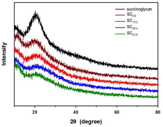 X-ray diffraction (XRD) measurements were obtained to examine the molecular crystallinity of SCx. As shown in Figure 5, succinoglycan exhibited a large selection at 2θ = 20.5°. The diffraction peak of SCx was similar to that of succinoglycan. However, increases in the strength of SCx from SC6.6 to SC52.8 decreased crystallinity. The amorphous region of the succinoglycan polymer matrix was augmented by the addition of Cr3+. This indicates that succinoglycan changes from a crystalline to an amorphous state, thereby indicating that intermolecular hydrogen bonds between metal cations and hydroxyl-/carboxyl groups of succinoglycan occurred for a metallohydrogel [50,51,52]. The results indicated that the addition of Cr3+ changes the intrinsic crystallinity of succinoglycan and generates another regular molecular arrangement.