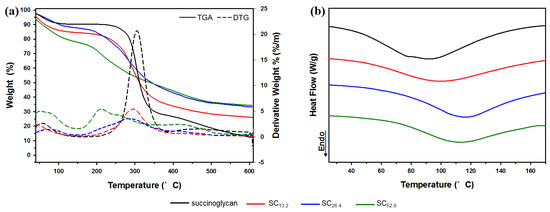 Figure 6 shows TGA and differential thermogravimetry (DTG) diagrams of succinoglycan and SCx. As shown in Figure 6a, the thermal degradation of succinoglycan is divided into two stages. The first mass loss explained the loss of hydrogen bonds and absorbed water molecules attached to the carboxyl group of succinoglycan. The initial moisture content of the samples was attributed to high levels of carboxyl groups of succinoglycan interacting with water molecules [53]. The result explains the high moisture and water affinity of succinoglycan given its high content of carboxyl groups [54]. In the first stage, the mass loss of succinoglycan and SCx was 8.05% below 95 °C and 10–20% at approximately 110 °C, respectively (Table 2). In the second stage, succinoglycan exhibited a mass loss of 60.64% in the temperature range of 246.14–370.80 °C. In the case of SCx, a second-stage temperature was formed at a lower temperature than that of succinoglycan. With respect to SC13.2, a loss of 53.08% occurred in the temperature range of 213.12–477.24 °C. In particular, SC26.4 and SC52.8 resulted in mass losses of 49.38% and 38.03% over a wide temperature range of 187.51–484.08 °C and 178.57–480.20 °C, respectively. This was potentially due to the added decomposition of the SCx hydrogel network. Increases in the concentration of Cr3+ decreased the final mass loss. Therefore, the mass loss rate of SCx exhibited an inverse relationship with the concentration of Cr3+ ions. This indicated that the formation of hydrogels with metals reduced the skeletal degradation of succinoglycan. The results also indicated that the metallohydrogel exhibited better thermal stability than pure succinoglycan.