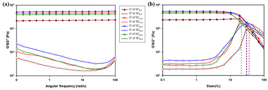 Stress oscillation strain amplitude sweep tests were conducted after fixing the frequency to 1.0 Hz to determine the limit point of the linear viscoelastic region. As shown in Figure 8b, the storage modulus (G′) of SCx stays constant in the strain range of 0.1–10%. Thus, this indicates that SCx can withstand high values of shear strain. Furthermore, this implies that SCx retained its gelling properties even at strains as high as 10%. When the strain exceeded 10%, the G′ value significantly decreased and the G″ value rapidly increased to generate a crossover point with values corresponding to 36% (SC6.6), 31% (SC13.2), 25% (SC26.4), and 22% (SC52.8). The network of each SCx was completely broken and converted into a sol state at that strain. Hence, the structure of the hydrogel network was completely damaged and exhibited fluid-like properties [60]. The difference in the critical strain values of the four hydrogels was potentially due to the flexibility of the gel network. In particular, SC52.8, with intersections at the lowest strain, indicate hard gels, and SC6.6, with intersections at higher strains, indicate soft gels. Thus, the flexibility of the formed SCx can be controlled by changing the concentration of Cr3+.