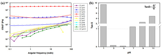 The effect of the manufacturing pH on the rheological properties of SCx was examined. As shown in Figure 10a, the range of gel formation was determined by the pH. The experiment was compared by considering six points in the range of pH 1 to 11. The results indicated that G′ exceeded G″ in the weak acidic pH range of 3 to 5, thereby indicating that gelation occurred in the pH range of 3–5. However, the sample lost its elastic properties outside the aforementioned range of pH. This is demonstrated by the appearance of the intersection of G′ and G″ by changing the rheological behavior (Figure S2). The loss tangent (tanδ (G″/G′)) is a dimensionless parameter that measures the ratio of energy lost to energy stored in a cyclic deformation [53]. As shown in Figure 10b, strongest hydrogels are formed with the smallest tanδ values at pH 5, and this confirms that pH is an important factor that affects the metal co-ordination of succinoglycan and Cr3+. This is related to the nature of interactions based on the structure of the chromium species formed in water and formation of carboxyl groups. In extremely acidic conditions (such as a pH less than 3), Cr3+ predominantly exists in the monomeric form, and (Cr(H2O)6)3+ is co-ordinated with six water molecules [61,62]. Given that the Cr3+ monomer is small, it cannot be effectively co-ordinated with the carboxyl group (pKa~3.8) of succinoglycan, where protonation of the carboxylic group can also impede their interactions with Cr3+ [63]. However, a higher pH range from 3 to 5 can lead to olate forms of Cr3+ (dimeric, trimeric, and tetrameric oligomers), which can lead to successful co-ordination with succinoglycan [43]. In neutral or alkaline conditions with higher pH at which gel formation occurs, chromium ions changed to green in aqueous solution and were converted to water-insoluble hydroxide Cr(OH)3 [64]. In summary, only in the pH range of 3–5 (in which the gel was formed) did Cr3+ in the form of olates form an effective co-ordination with the deprotonated carboxyl group of succinoglycan.