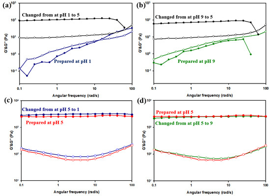 Gelation effect and mechanical properties of SC26.4 based on pH changes: (a) from pH 1 to 5, (b) from pH 9 to 5, (c) from pH 5 to 1, and (d) from pH 5 to 9. Storage modulus (G′, filled symbols) and loss modulus (G′′, empty symbols) of hydrogels were measured as a function of angular frequency (0.1–100 rad/s).