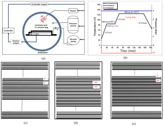 Molding process; (a) Flow diagram of autoclave molding method; (b) Cycle of molding and curing conditions, (c–e) Stacking sequence diagram of [0°]36, [0°/90°]18, [+45°/−45°]18, respectively.